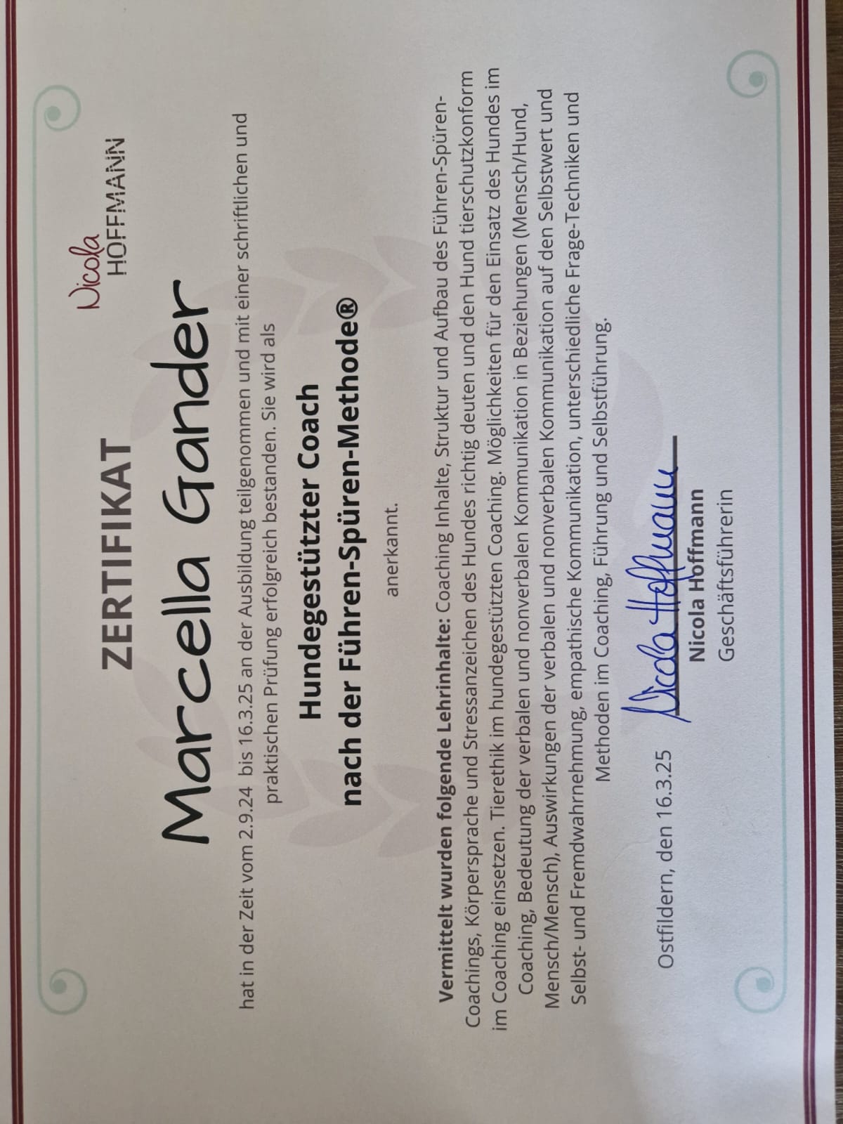 Über den schulischen Kontext hinaus habe ich eine Ausbildung zum hundegestützten Coach nach der Führen-Spüren Methode gemacht um Menschen in Einzel-Coachings in ihrer Persönlichkeitsentwicklung zu begleiten.
